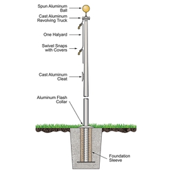 Gold anodized aluminum ball ornament with cast aluminum revolving truck with pulley. Solid braided polypropylene halyard. Brass swivel flag snaps with vinyl covers. Cast aluminum cleat with mounting screws. Easy instructions for quick installation. Please inquire about our Bronze and Clear finished flagpoles!