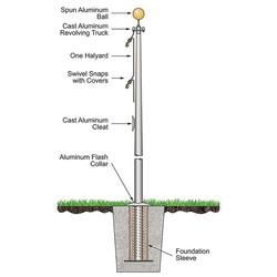 Gold anodized aluminum ball ornament. Cast aluminum revolving truck with pulley with solid braided polypropylene halyard. Brass swivel flag snaps with vinyl covers. Cast aluminum cleat with mounting screws and spun aluminum flash collar. Easy instructions for quick installation. Please inquire about our Bronze and Clear finished flagpoles!